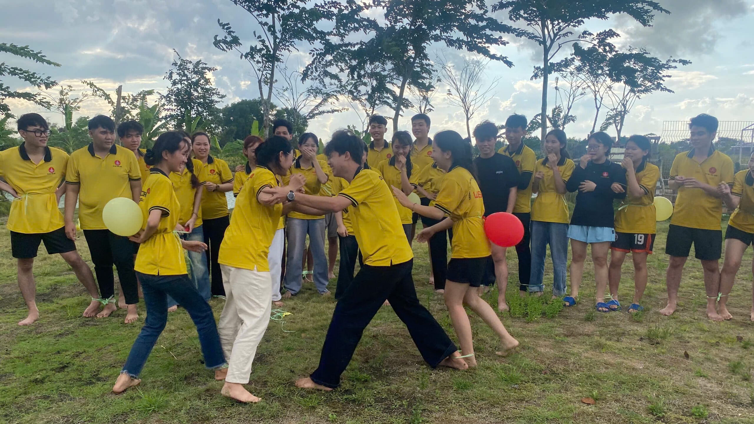Đầu tiên các học viên sẽ được khởi động với trò chơi “phá bóng sau lưng” mang đến những tràng cười sảng khoái, giúp các bạn xích lại gần nhau hơn qua từng khoảnh khắc vui nhộn.