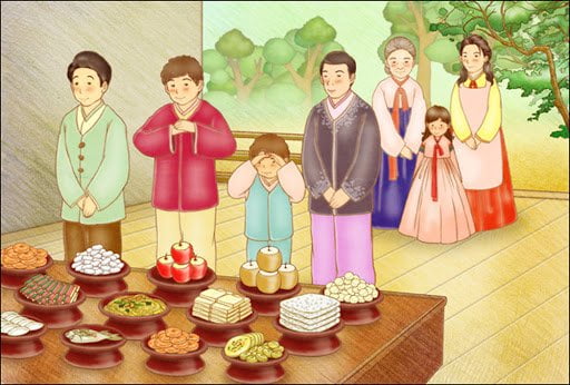 Cũng giống với Tết Trung thu Hàn Quốc, ngày đầu tiên của dịp lễ sẽ được bắt đầu với việc thờ cúng tổ tiên của mình, một mâm cỗ cúng đầy đủ sẽ được chuẩn bị và bày biện cẩn thận trên bàn.